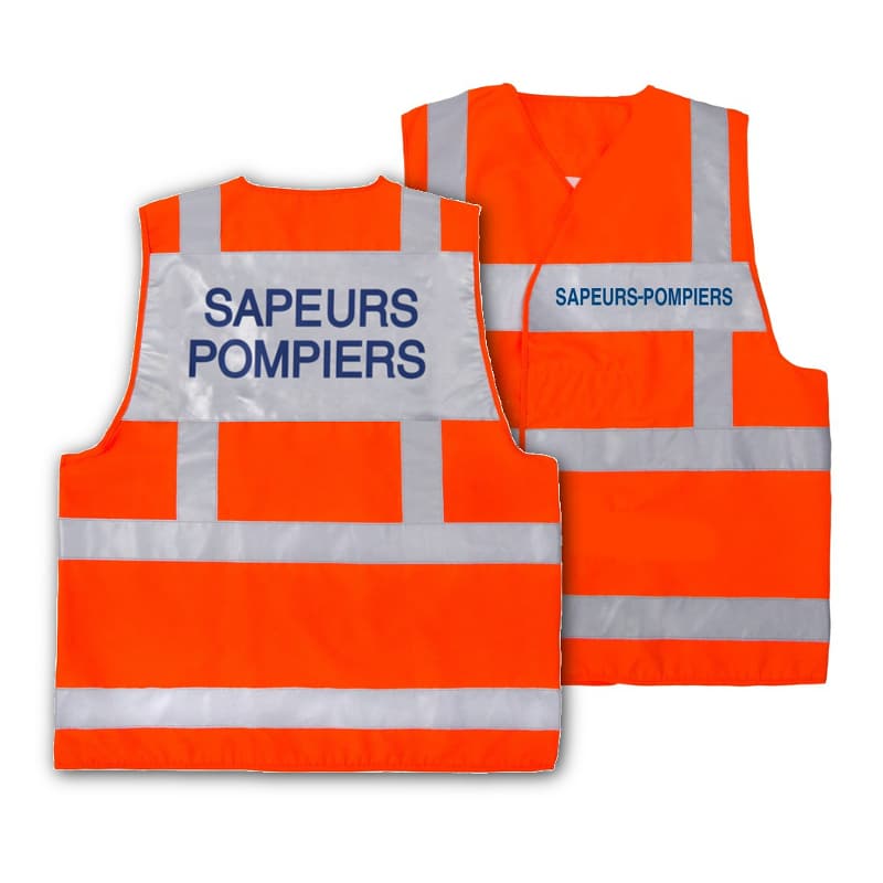 Sérigraphie directe une couleur du marquage « SAPEURS-POMPIERS » sur le bandeau rétroréfléchissant microbilles cousu au dos du gilet.