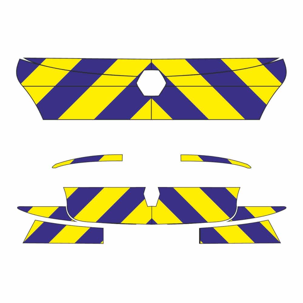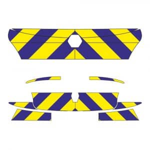 Bandes alternées bleues et jaunes citron fluo rétroréfléchissantes horizontales, hauteur minimum 0,14 m sur toute la largeur du véhicule, chevron centré et pointé vers le haut.