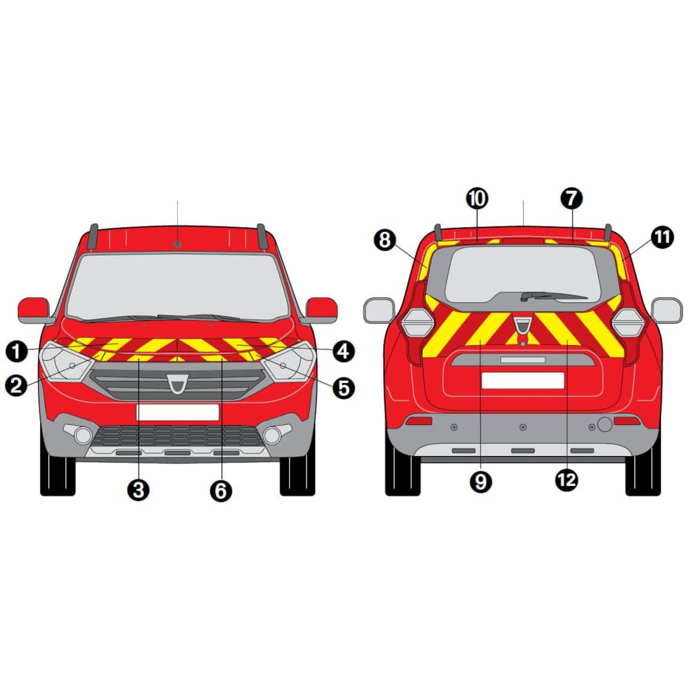 Pour les engins de type VSAV et VSR, la totalité de l’arrière doit être recouverte de bandes alternées avec chevron centré et pointé en haut à l’exception des parties vitrées et des rideaux.