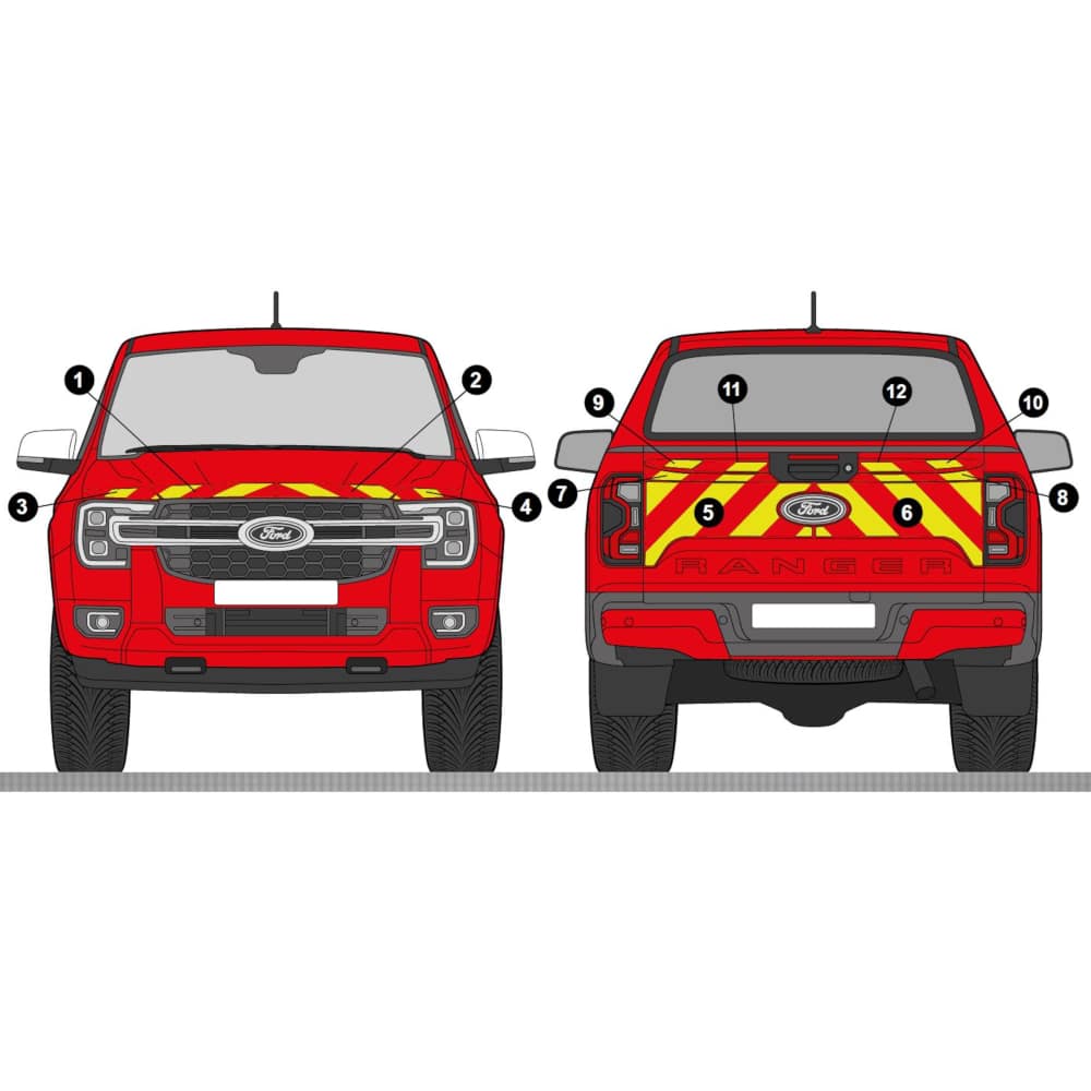 Pour les engins de type VSAV et VSR, la totalité de l’arrière doit être recouverte de bandes alternées avec chevron centré et pointé en haut à l’exception des parties vitrées et des rideaux.