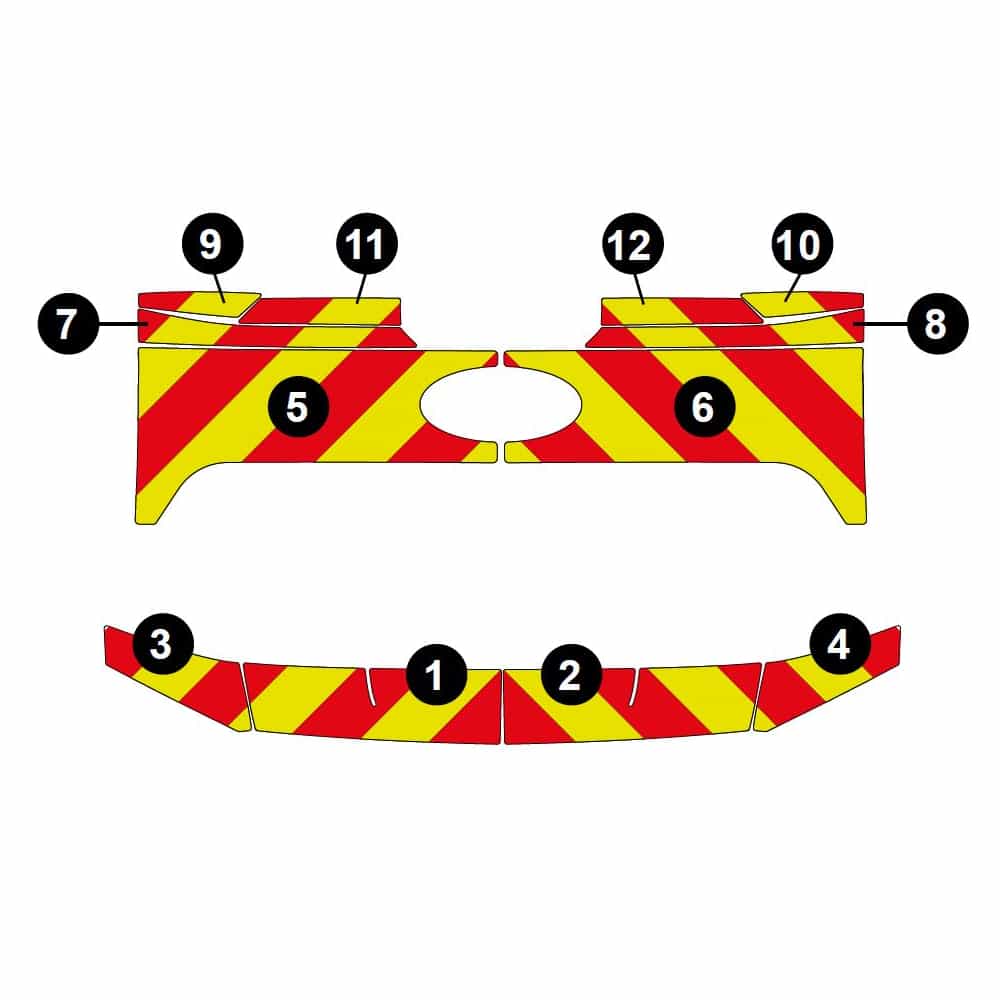 Bandes alternées rouges rétroréfléchissantes et jaunes citron fluoréfléchissantes horizontales, hauteur minimum 0,14 m sur toute la largeur du véhicule, chevron centré et pointé vers le haut.