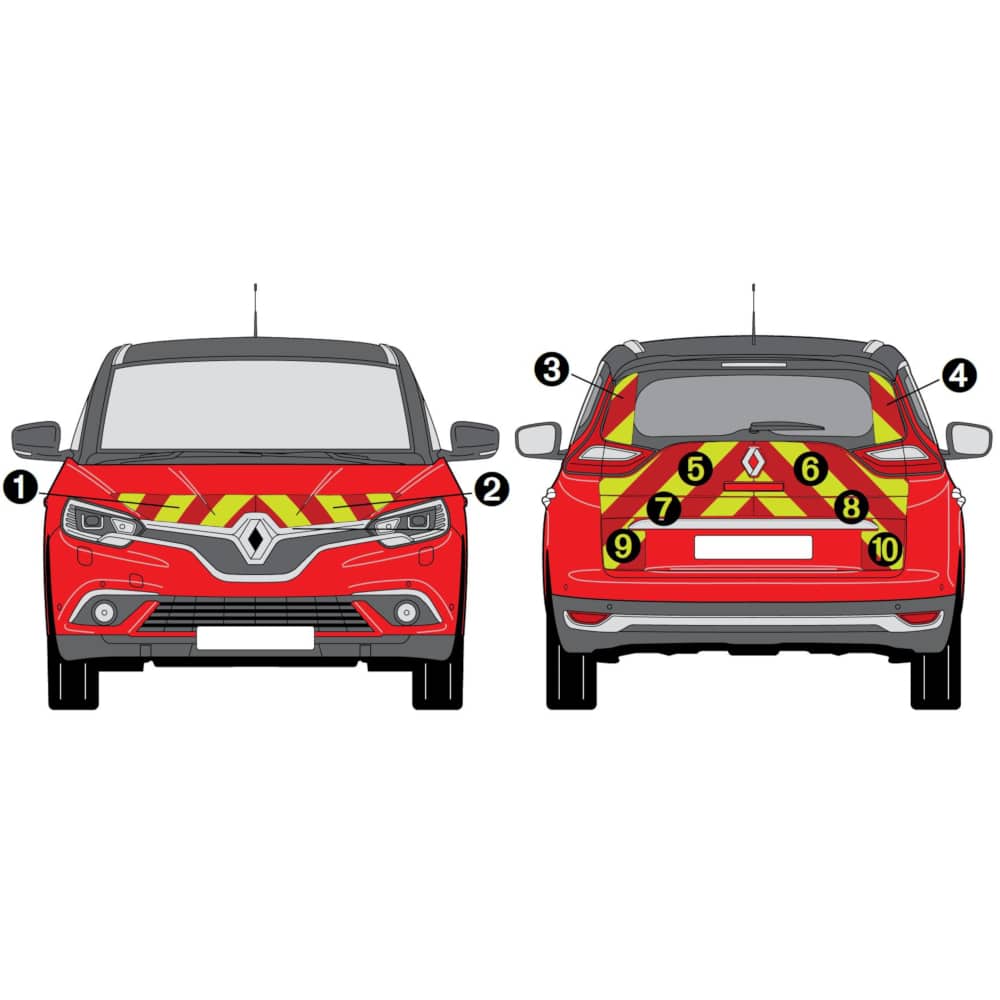 Pour les engins de type VSAV et VSR, la totalité de l’arrière doit être recouverte de bandes alternées avec chevron centré et pointé en haut à l’exception des parties vitrées et des rideaux.