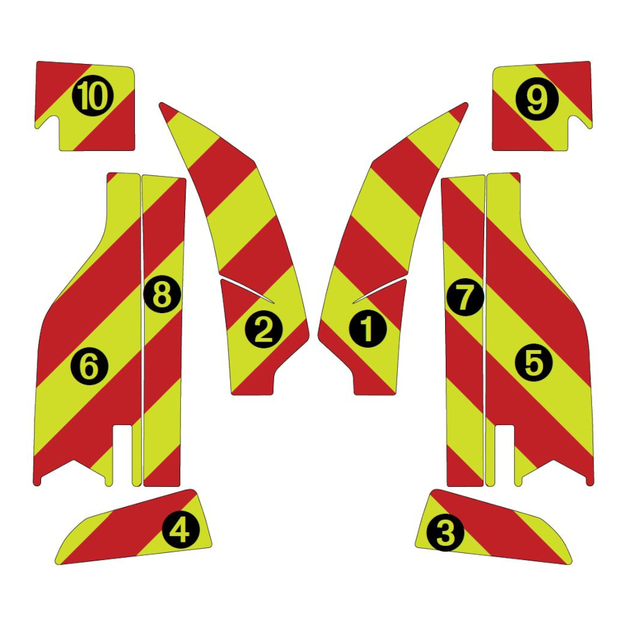 Bandes alternées rouges rétroréfléchissantes et jaunes citron fluoréfléchissantes horizontales, hauteur minimum 0,14 m sur toute la largeur du véhicule, chevron centré et pointé vers le haut.