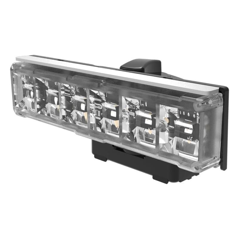 L’optique grand angle TIR couplée à la possibilité d’ajuster la direction d’émission de ces éclairages garantit une émission de lumière à 360 ° conforme SAE Classe I, Cal. T13 et ECE R65. Chaque module offre un rayon horizontal uniforme sur 120 ° et peut être positionné n’importe où le long du rail d’alimentation, à l’avant, à l’arrière ou dans les coins (à 45°).
